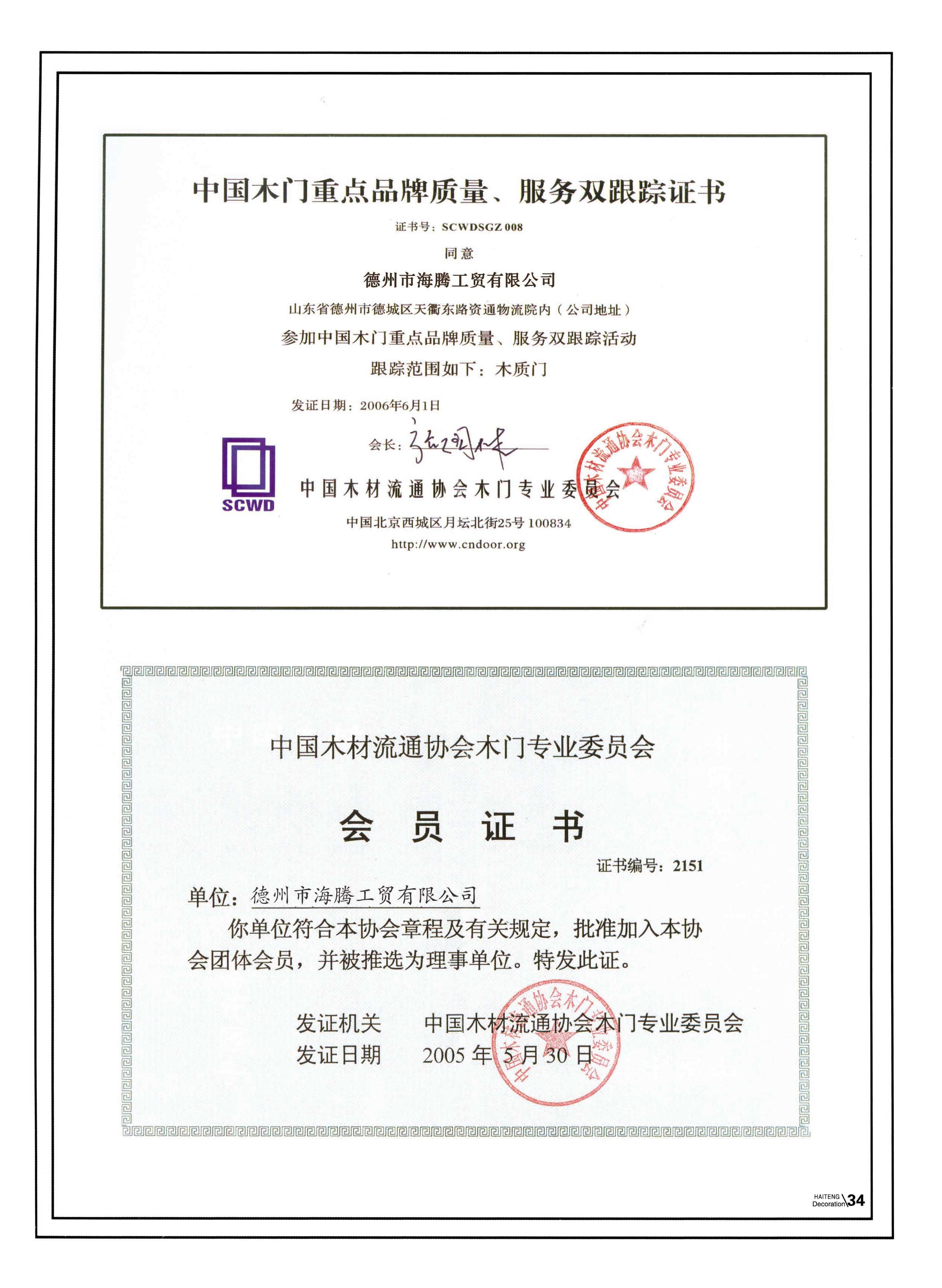 中國(guó)木材與木制品流通協(xié)會(huì)木門(mén)專(zhuān)業(yè)委員會(huì)副會(huì)長(zhǎng)單位,堅(jiān)持走"專(zhuān)精特新"發(fā)展之路。